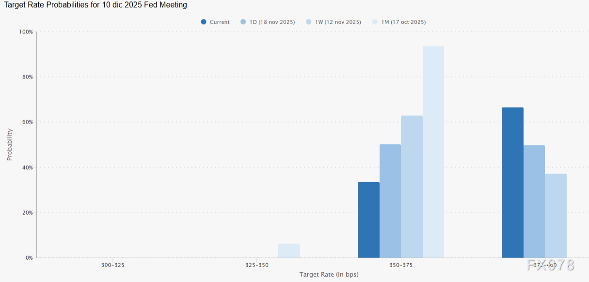 虽然9月就业数据尚未公布,但本次纪要已显著扭转市场对美联储12月10日会议的预期。根据芝加哥商品交易所观测,基准利率维持在4.00%的概率已升至67.2%,而降息至3.75%的可能性则降至32.8%,为一个月来最低水平。这与前几周的市场预期形成了显著反差。
