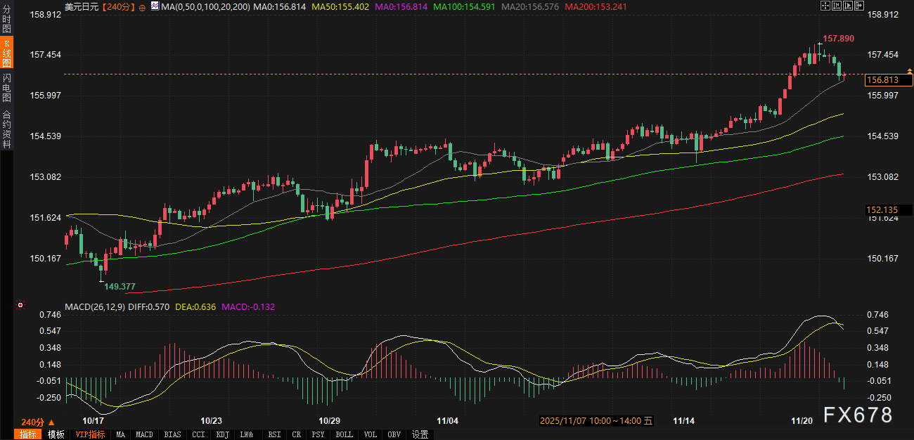 从技术指标观察,美元兑日元仍处于稳固的上升通道内。4小时图上,汇价稳定运行于所有关键均线上方:20周期均线156.577提供近期支撑,50周期均线155.403、100周期均线154.592和200周期均线153.241形成多层防御网络。当前均线系统呈多头排列,表明中期趋势依然向好。