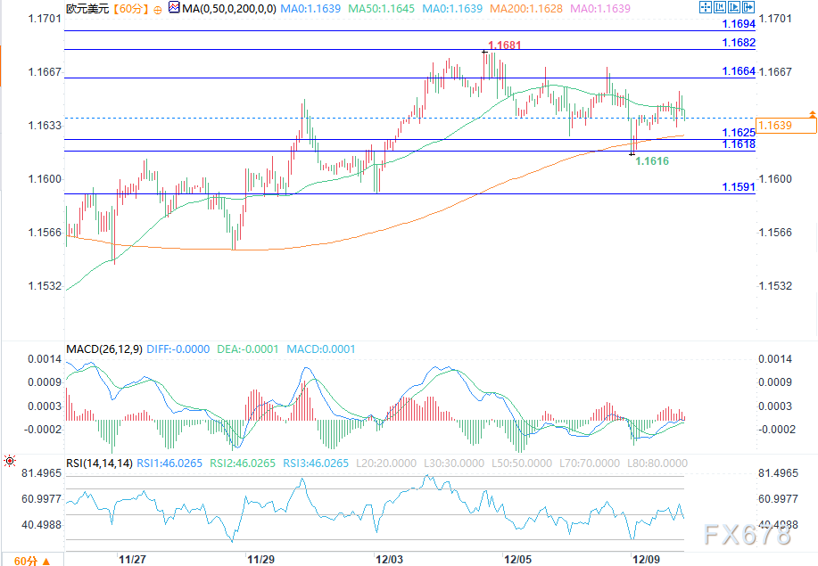 汇通财经APP讯——周二(12月9日)欧盘时段,在欧元/美元的分时走势中,短期价格节奏贴合 “温和看跌” 的技术基调:日内价格先以震荡上行姿态触及 1.1655 附近的阶段高点,随后伴随多头动能衰减快速回落,当前围绕1.1639一线整理。