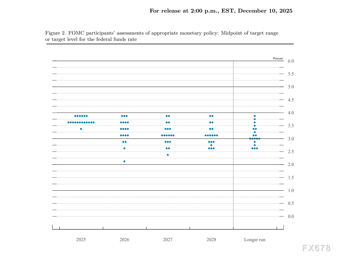 2026年利率路径的预测分歧尤为突出:在19位官员中,7人认为2026年应全年维持当前利率水平不降息,3人甚至主张应启动加息一次,这意味着“不降+加息”的鹰派阵营合计达到10人,占比首次超过50%,达到52.6%;而在鸽派一端,出现了点阵图历史上从未有过的极端观点——1位官员认为2026年应累计降息6次,总降幅达到150个基点,与鹰派阵营的观点形成鲜明对立。此外,在2025年终利率的预测中,有6位官员选择了3.75%-4.00%的区间,这一预测区间明显高于本次会议确定的3.50%-3.75%目标区间,相当于明确暗示“12月本不应进行本次降息”。