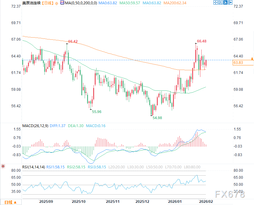 中期运行区间为75.12美元–54.70美元,对应的斐波那契回撤阻力区间为64.91–67.32美元,该区域在1月30日当周曾压制油价于66.48美元见顶回落。